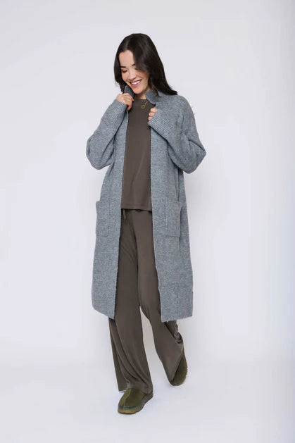 Our Vivian cardigan is a staple piece you'll wear over and over. Perfect as a sweater jacket on cool Fall days or layer it up as it gets colder. Slightly slouchy fit, midi length, open front in our super soft, super stretch mid weight yarn, with a high neck and patch pockets.