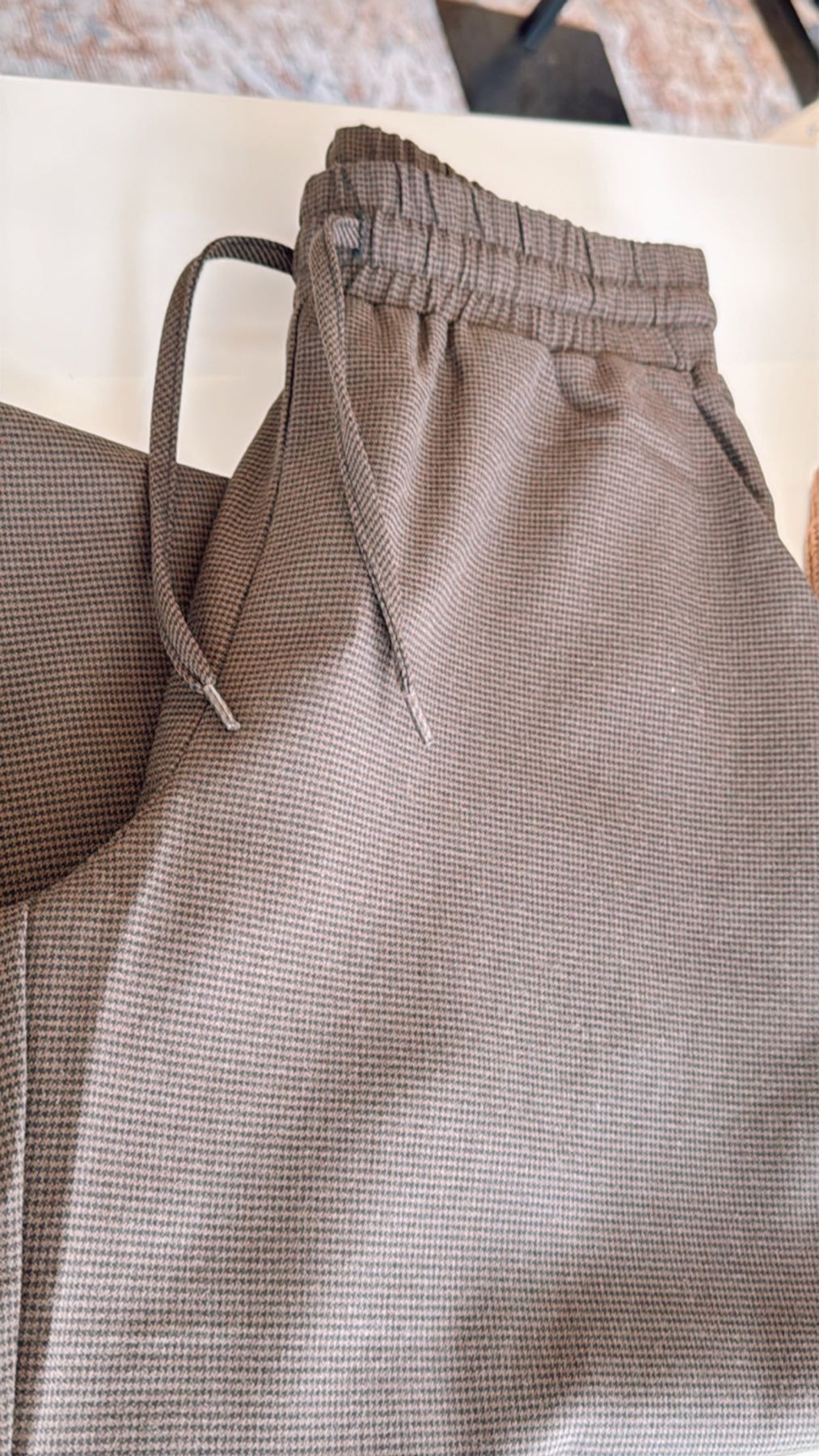 Step into comfort and style with the Chloe Wide Leg Trouser in coffee houndstooth. These pull-on pants feature a playful wide-leg cut and an adjustable drawstring waist, making them perfect for lounging or dressing up. The classic houndstooth pattern adds a touch of timeless charm to your everyday look.