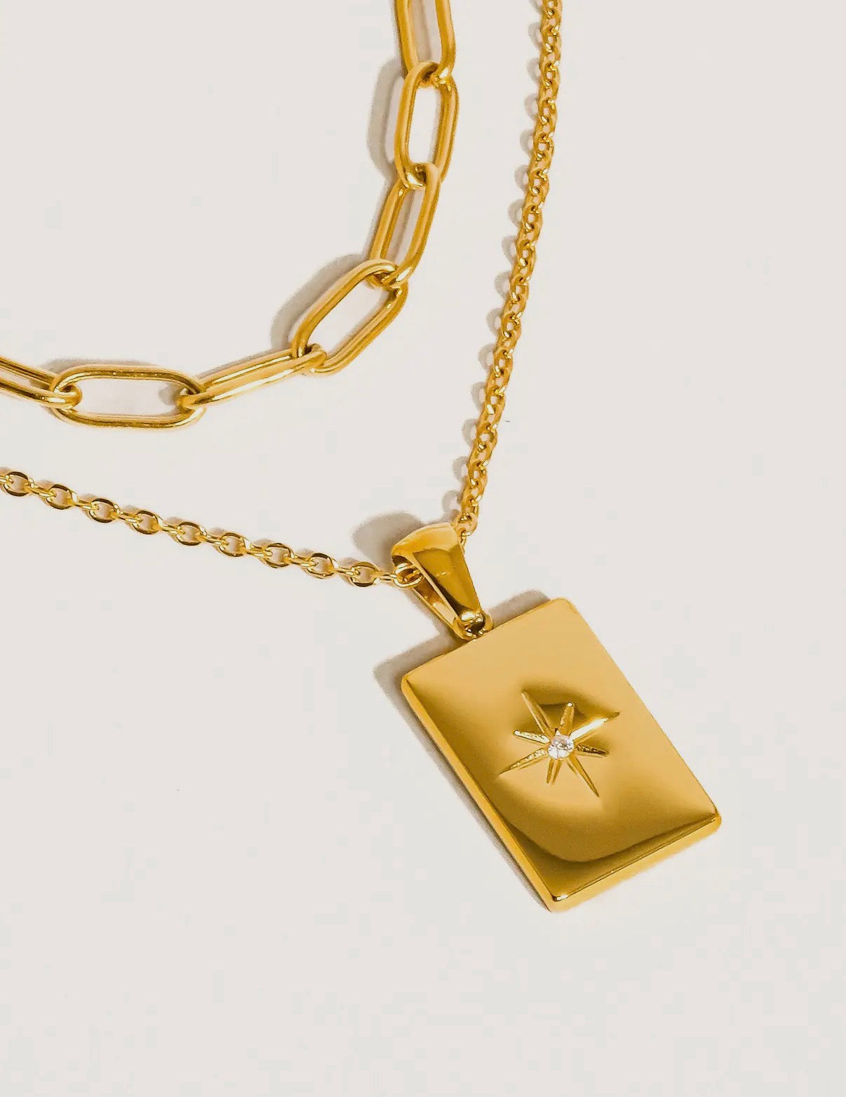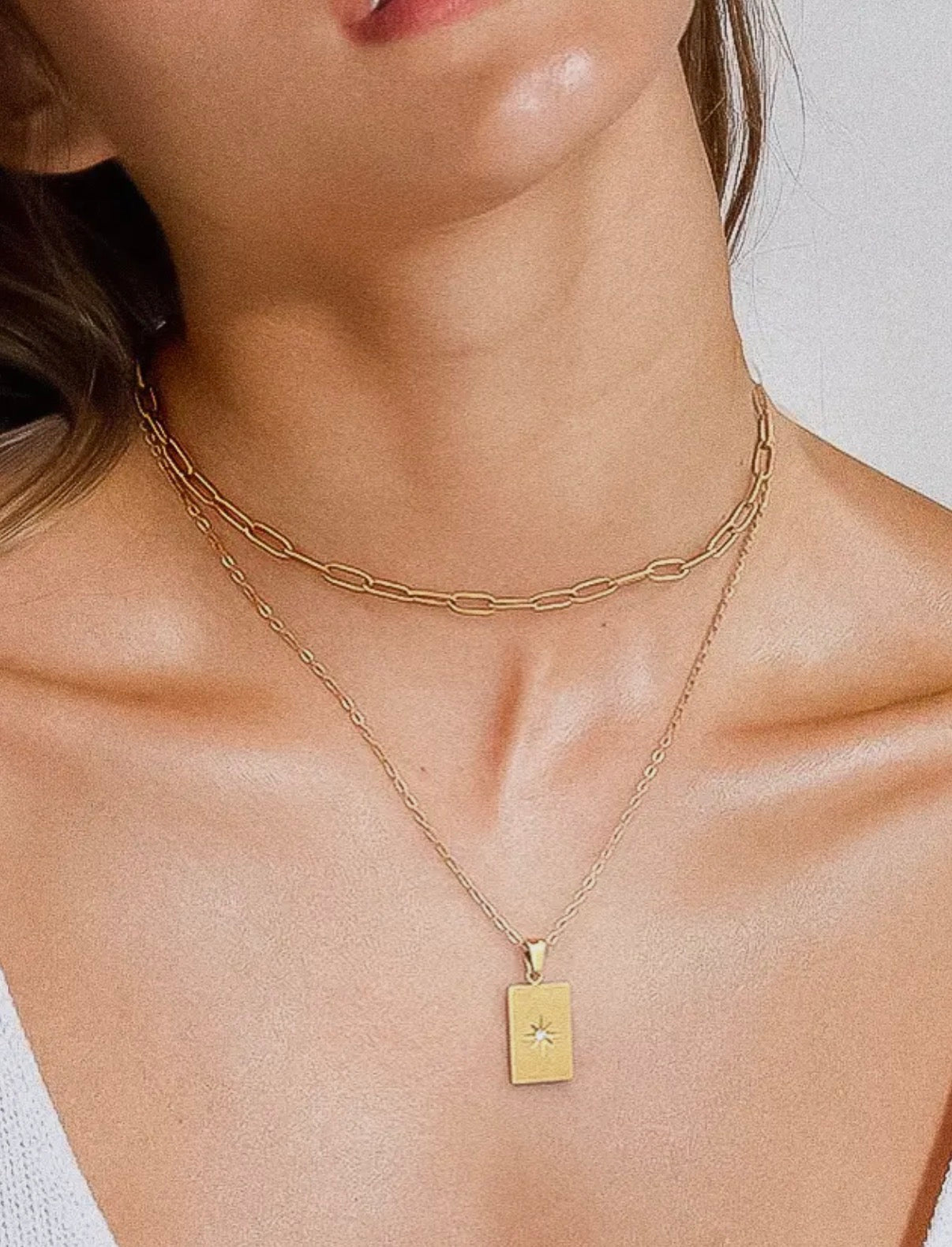 Mix and match celestial vibes with the Gabin Layered Astro Chain. This playful trio features a chunky paperclip chain paired with a delicate dainty chain, both anchoring a gorgeous square pendant adorned with a star on an extended chain. Stack them together for maximum impact or wear individually—the choice is yours. Perfect for adding dimension and personality to any outfit.