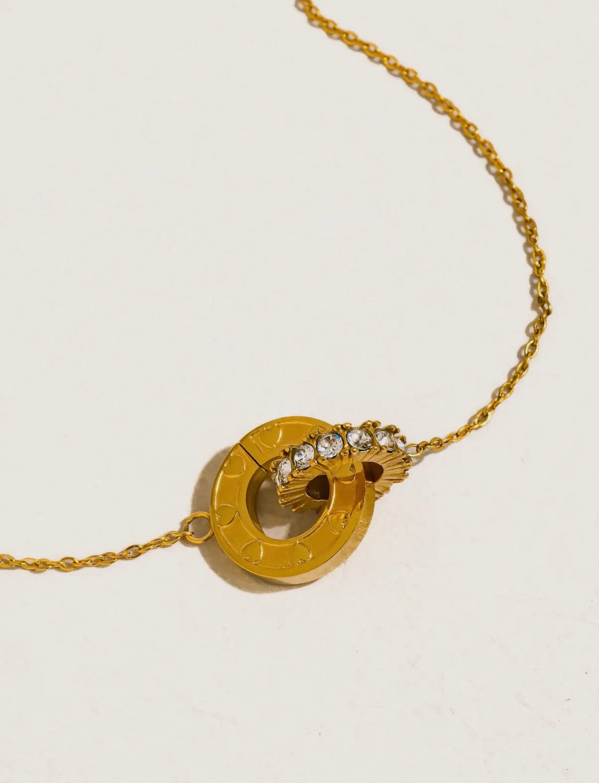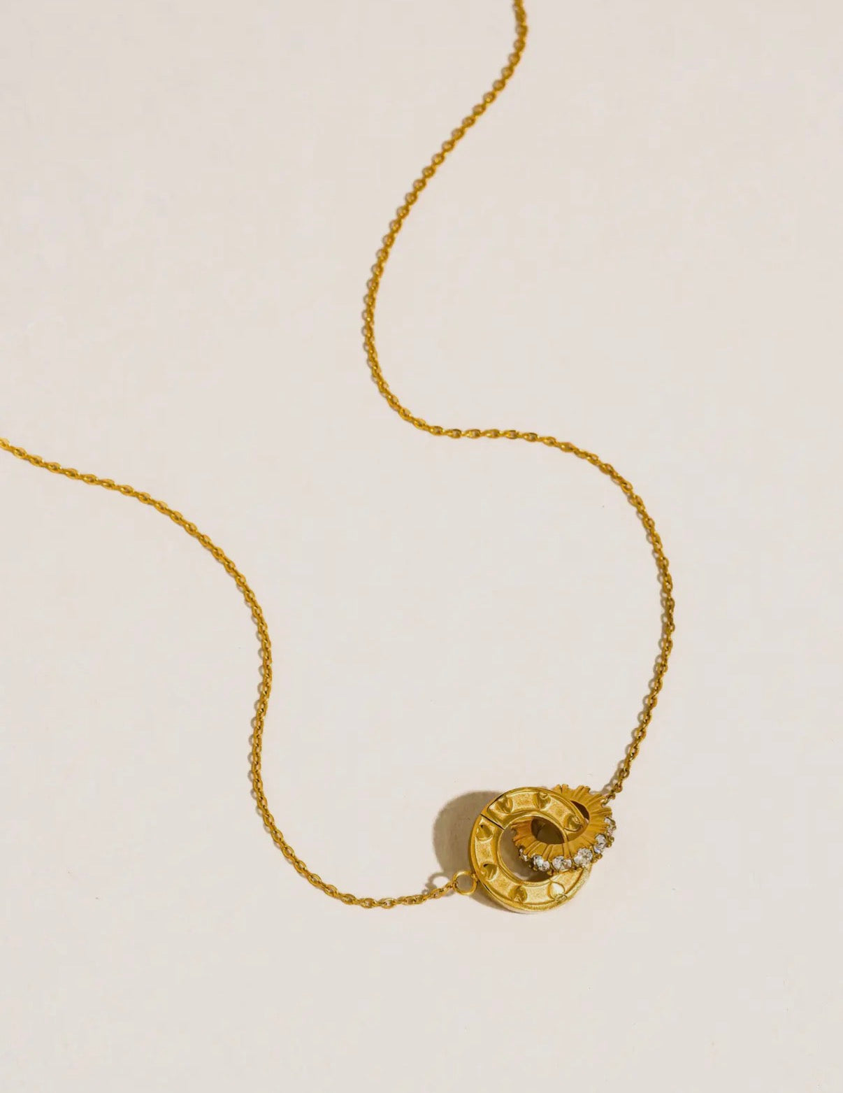 Elevate your everyday style with the Glazine Necklace, a charming gold pendant featuring two linked circles that dance together in perfect harmony. This playful design captures a sense of connection and movement, making it the ideal accessory for anyone who loves modern, minimalist jewelry with a touch of whimsy. Layer it, wear it solo, or gift it to someone special—this versatile piece brings a little extra sparkle to any outfit.