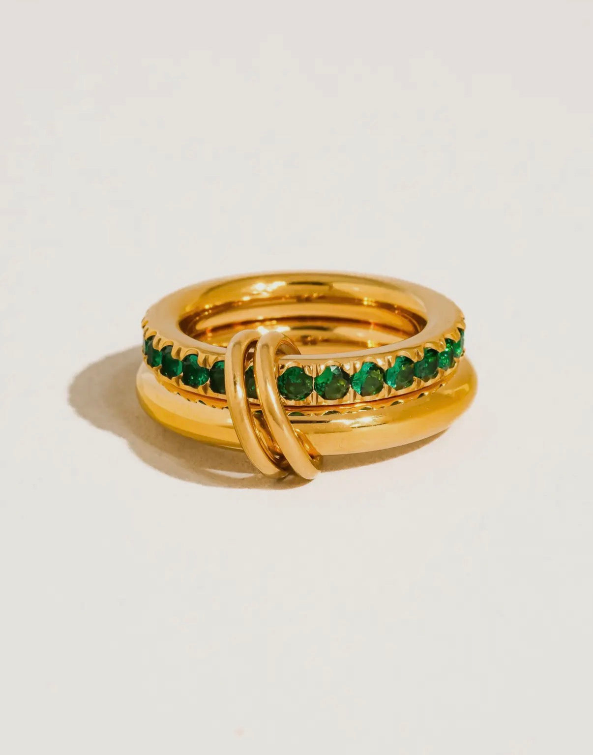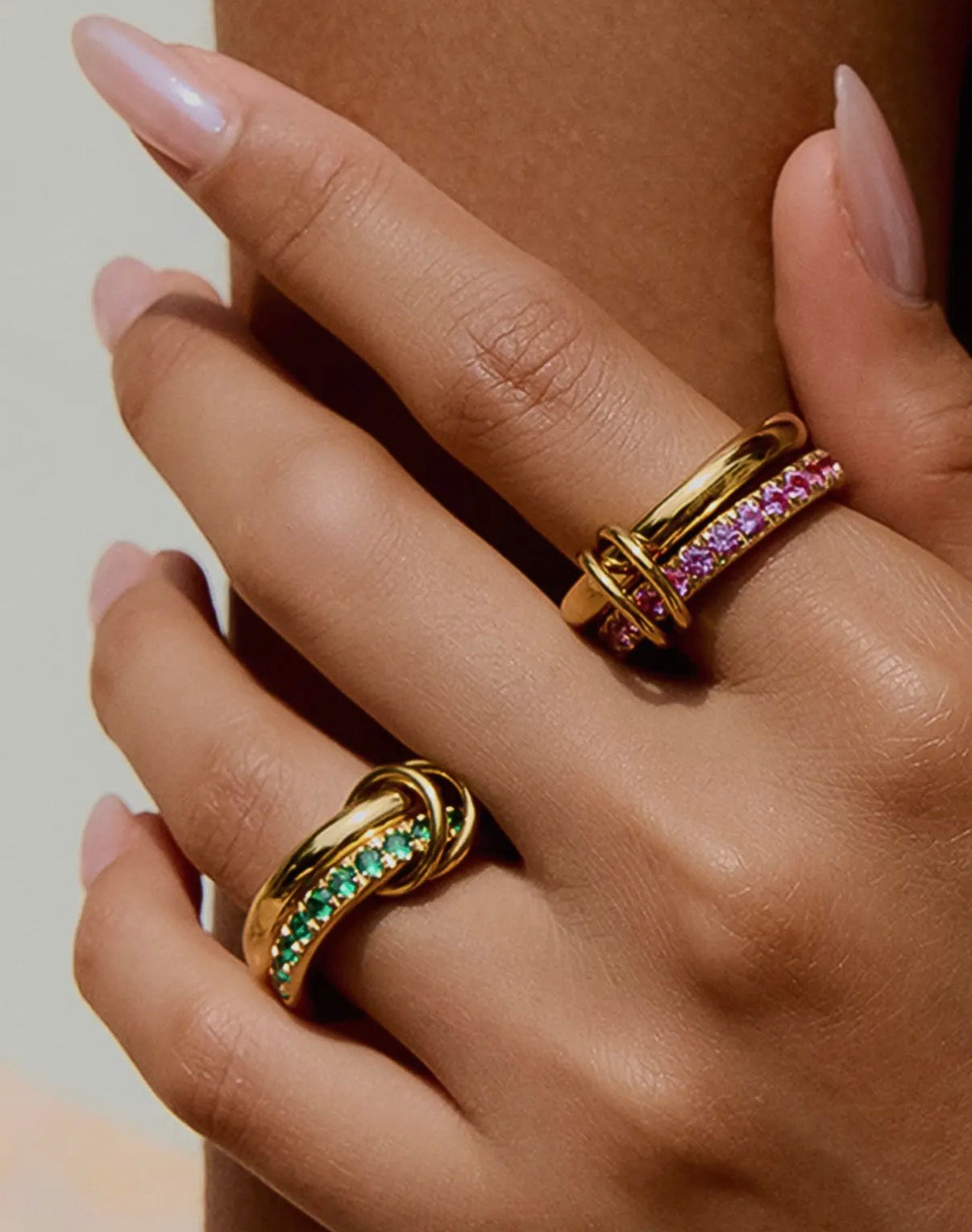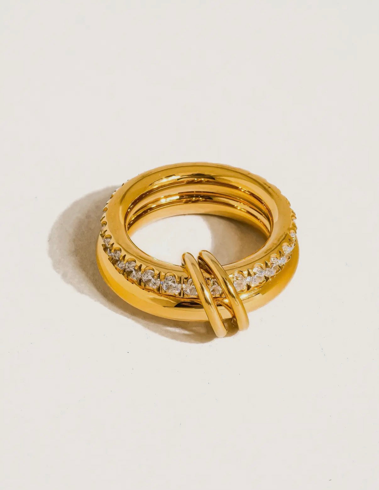 Stack elegance with the Justine Double Hoop Ring—a playful take on timeless style. This dynamic duo features a sparkling pavé stone ring connected to a sleek gold band via delicate hoops, creating an effortlessly chic layered look. Perfect for mixing metals and making a statement, whether worn together or separately for versatile everyday glamour.