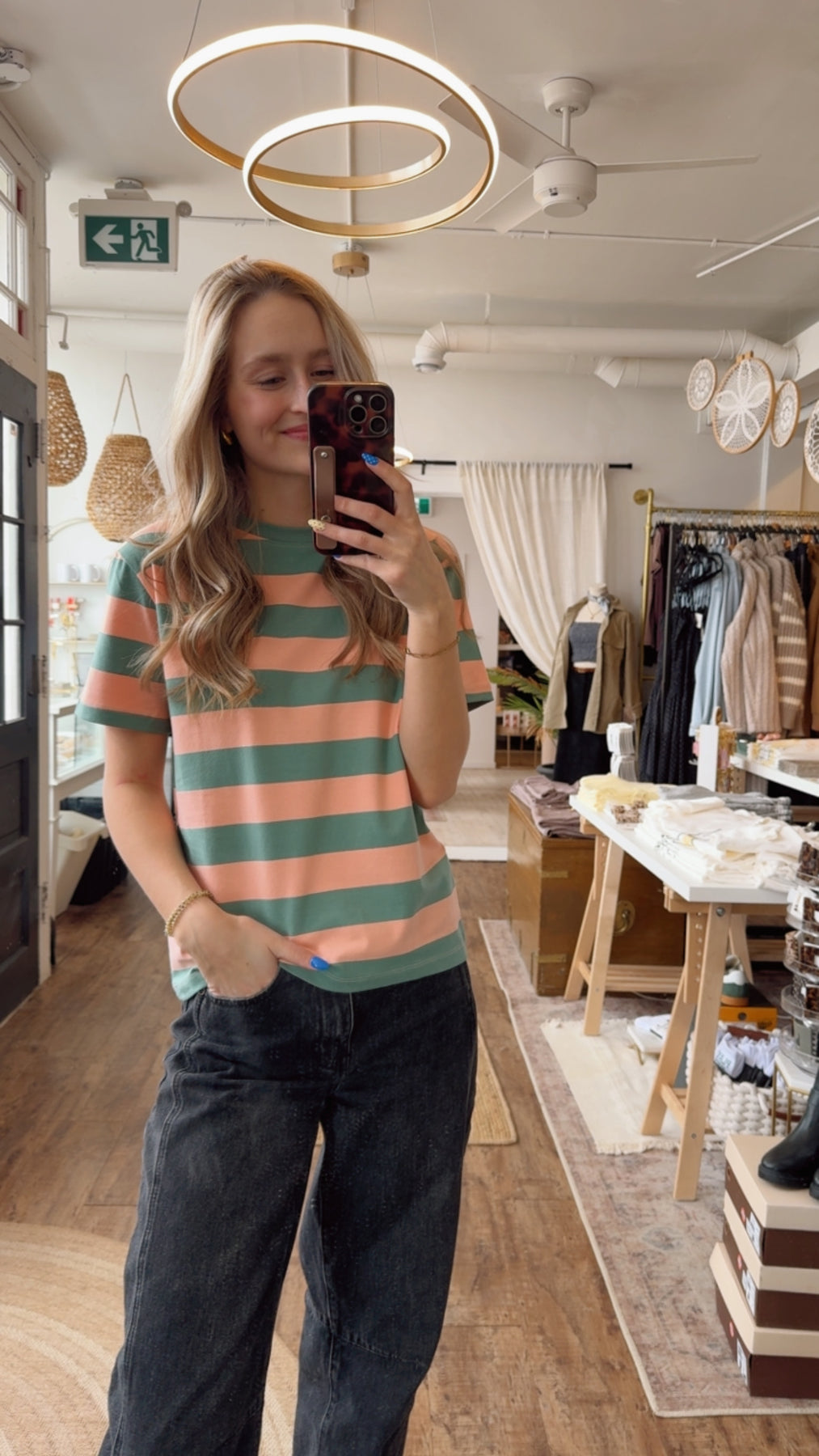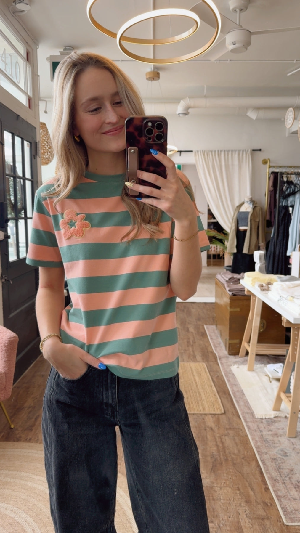 Bring vintage charm to your everyday wardrobe with this Retro Bloom Tee. Featuring classic green and pink stripes paired with a terry cloth flower design on the front left, this tee combines nostalgic style with modern comfort. Perfect for casual outings or layering, it's a versatile piece that adds a playful pop of color to any look.